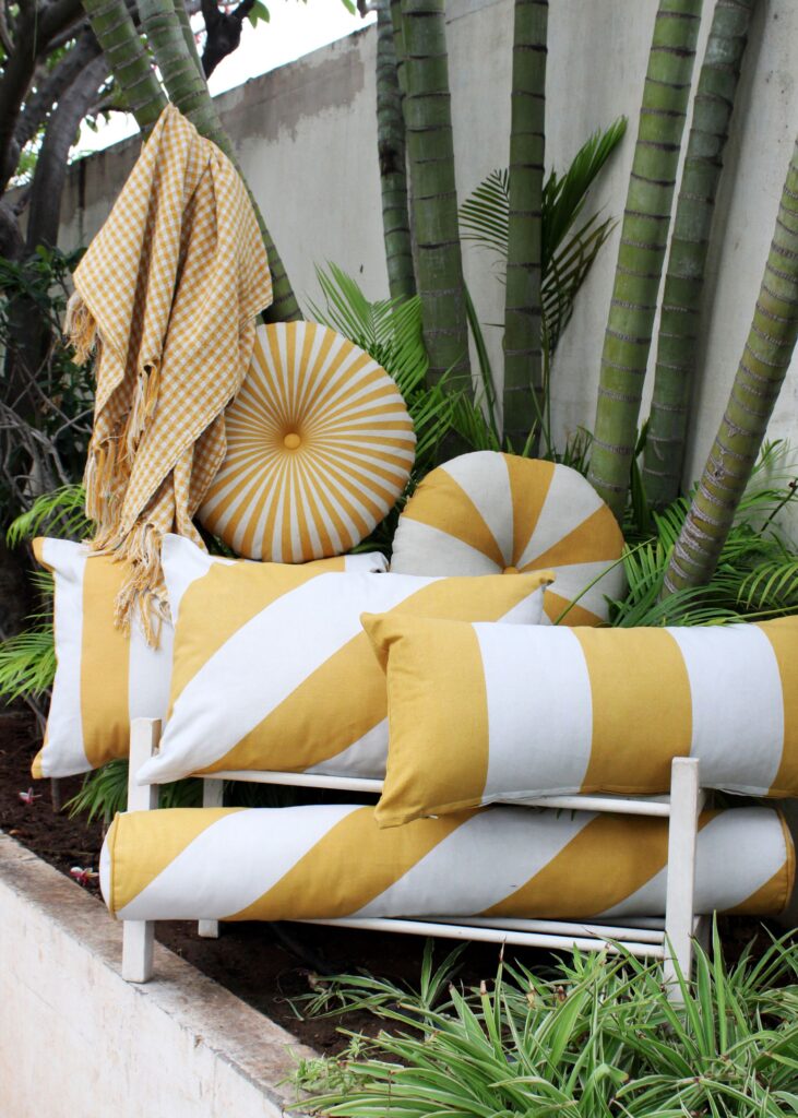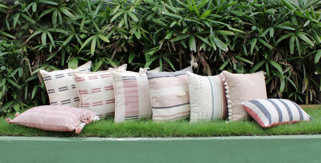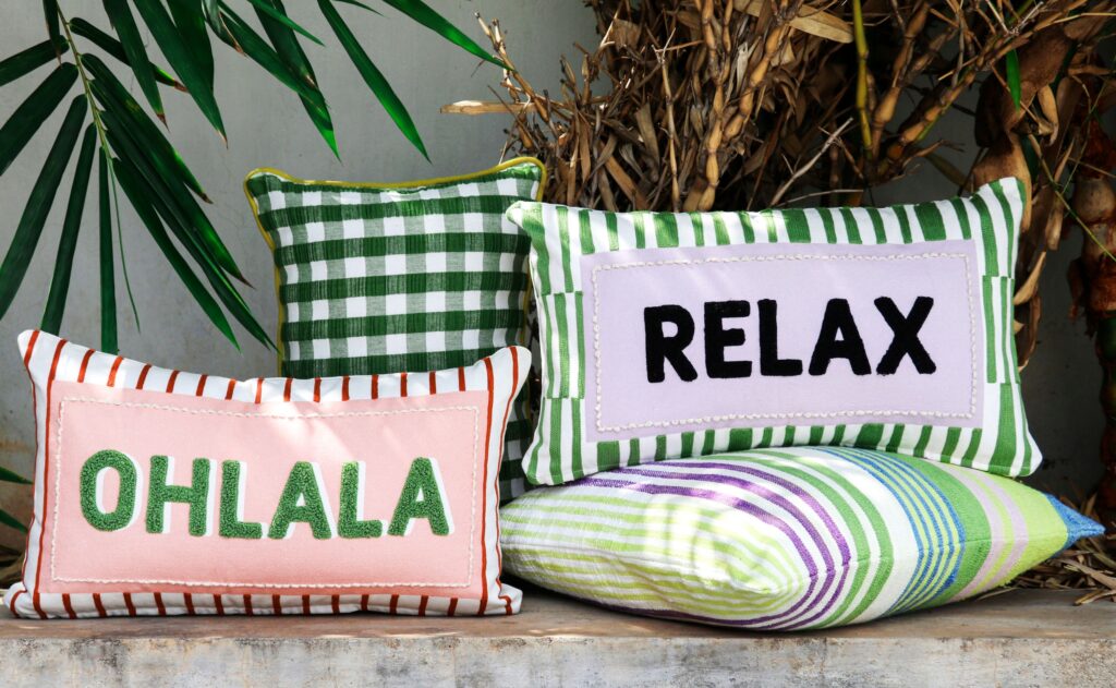 - Coordinated cushions, table & kitchen textiles inspired by earthy palettes enhanced with synthetic accents like acidic green and digital lilac